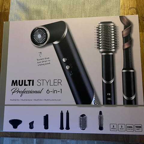 Multistyler hårstyler i grå og rosa utførelse med flere utskiftbare tilbehør. Enheten har hoveddel med strømledning og av/på-bryter, samt ulike munnstykker for styling av hår. Tilbehøret inkluderer blant annet runde børster, varmebørste og sylindriske krølleverktøy som festes på hovedenheten. Produktet er egnet til tørking og styling av hår ved hjelp av varm luft og utskiftbare børste- og krøllehoder. Strømtilkobling via vanlig støpsel for innendørs bruk. Merket er ukjent men er en dyson dupe! Selges billig! Ta kontakt med spørsmål!