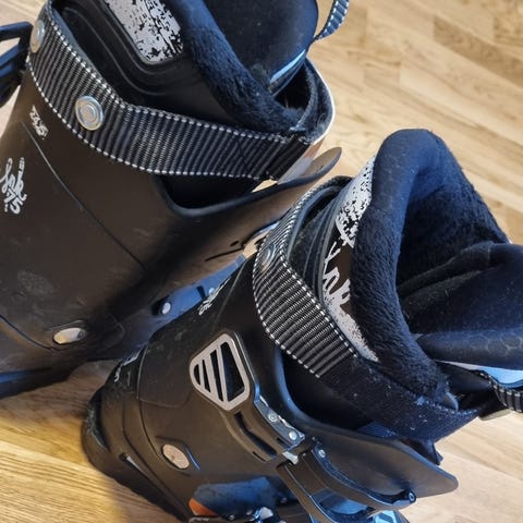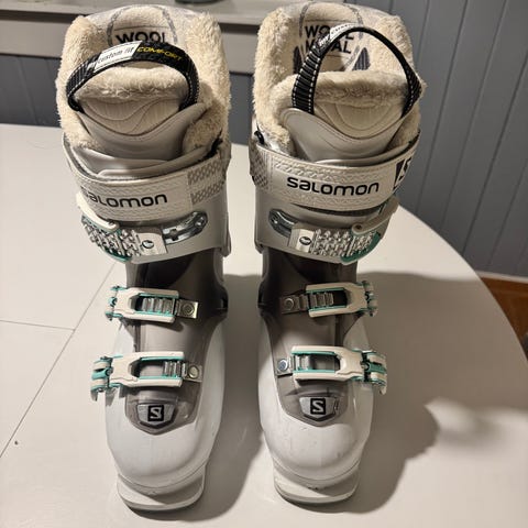 Salomon alpinstøvler i svart farge. Størrelse er merket 25–25,5/296mm/39,5 med lestbredde 104 mm. Støvlene har fire justerbare spenner i metall med mikrojustering for bedre tilpasning, samt kraftig stropp øverst for ekstra støtte rundt leggen. Myk og polstret innerstøvel gir komfort og varme. Passer til alpint bruk i preparerte bakker.