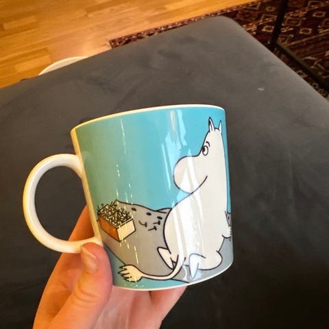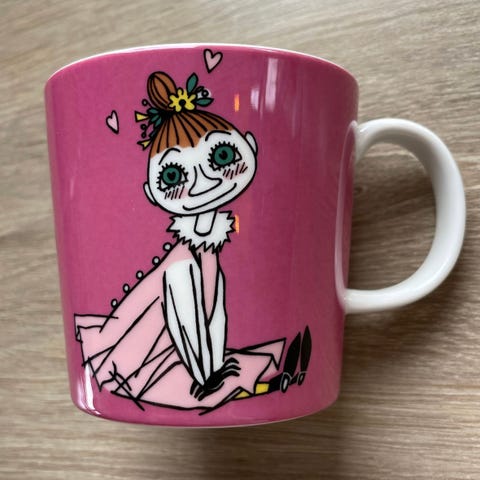 Mummitrollet kopp i porselen med rosa bakgrunn. Motivet viser karakteren Mymble i to ulike illustrasjoner på hver side av koppen.