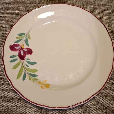 Fatet har et tidløst og sommerlig motiv med blomster i lilla og gult, grønne blader og en pen, mørkerød/lilla kantlinje langs den bølgete kanten.