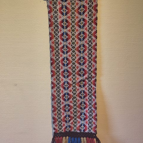 veggteppe med jaktmotiv i flerfargede toner. Tekstilt veggteppe med motiv av jeger og landskap, montert i ramme. Bredde ca. 67 cm. Egner seg som veggdekor i stue, gang eller hytte.