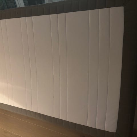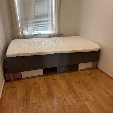 Sengen ble kjøpt ny på bohus sommeren 2025. Selve rammen har noen flekker etter transport. Madrassene er rene og flekkfrie.