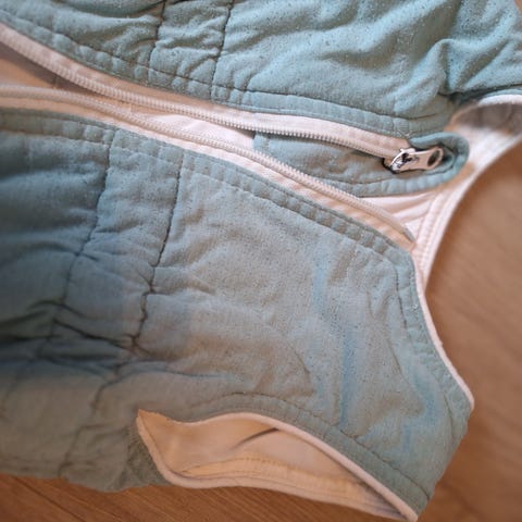 Sovepose til baby med hel glidelås foran. Er uten ermer og har lett vattering. Stoffet er lyst med små blomster i mønster. Egnet som nattpose eller sovepose i seng eller vogn for baby.