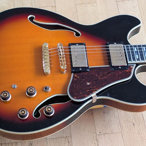 Her er en lekker og budsjettvennlig halvakustisk gitar (semi hollow guitar) av typen Ibanez AS 93 FM TCH i Cherry Red, klart inspirert av Gibson ES 335 eller ES 345. Ytterst pent brukt stand, minimalt med slitasje. Oppgradert med Gotoh Locking Tuners som tviholder på stemminga! Selges bare lokalt (Lillestrøm/Oslo) og hentes i medbrakt etui/bag.