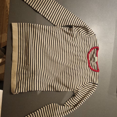 Genseren er i grå og hvit stripet ull, med lange ermer og rund hals med trykknapper i siden for enklere av- og påkledning. Unisex-modell som passer både gutter og jenter. Egnet som innerlag eller mellomlag på kjølige dager.