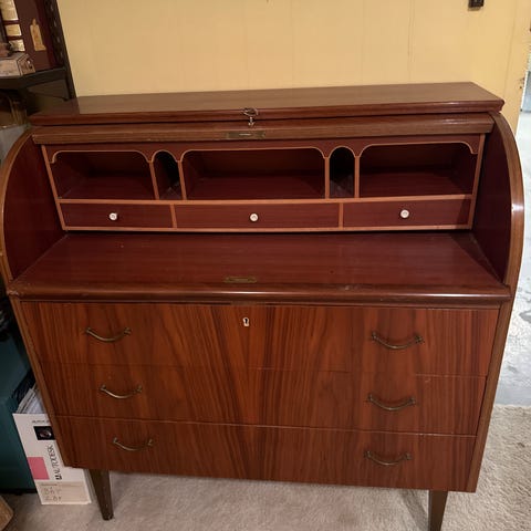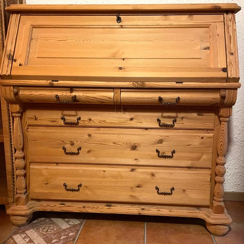 Pent Skatoll i furu. Malt i fargen pale linden. Knotter og håndtak lakkert i messing.