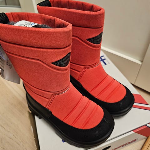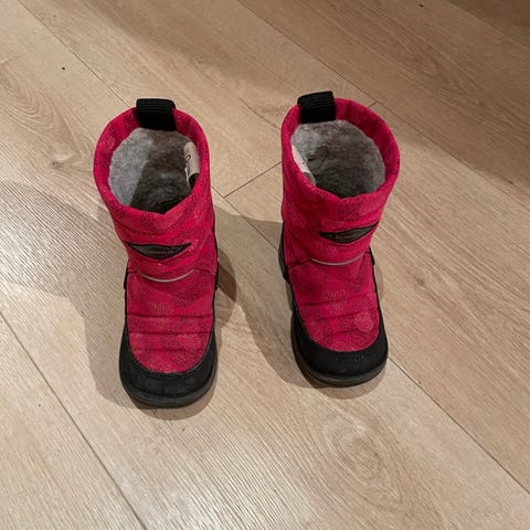 Kuoma vintersko til jente i størrelse 33. Støvlene er rosa med svart såle og forsterket tå- og hælparti. Grovmønstret yttersåle gir godt grep på underlaget. Fôret innside gir varme og komfort på kalde dager. Fantastiske vinterstøvler helt ned i -20 grader. Tåler også godt våt snø.