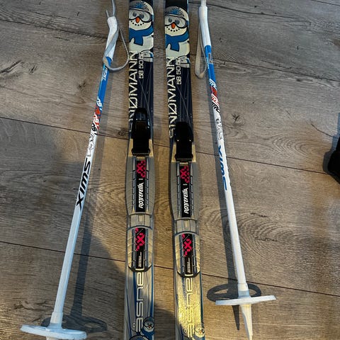 Åsnes «Snømann» barneski på 120 cm i rød farge med tilhørende skistaver på 110 cm. Skiene har integrerte bindinger som passer til vanlige barneskisko for langrenn. Staver med håndreimer. Egner seg til klassisk langrenn og lek på ski for barn i aktuell lengdeklasse.