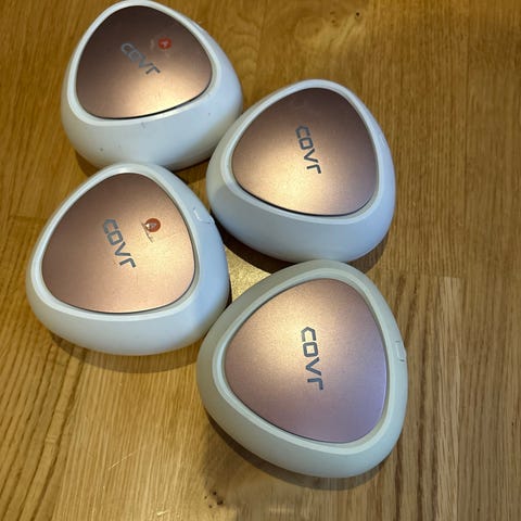 D-Link COVR-X1860 rmesh-system. Settet består av tre enheter med strømadaptere. Hver enhet har tilkoblinger for strøm, Ethernet WAN og Ethernet LAN, samt WPS-knapp. Systemet er egnet som trådløst mesh-nettverk i bolig der flere noder brukes for å gi dekning i flere rom eller etasjer.