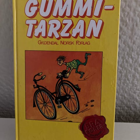 Ole Lund Kirkegaard Gummi-Tarzan bok. Innbundet utgave med gul forside og illustrasjon av gutt på sykkel. Boken er på norsk og tilhører sjangeren barnebok.
