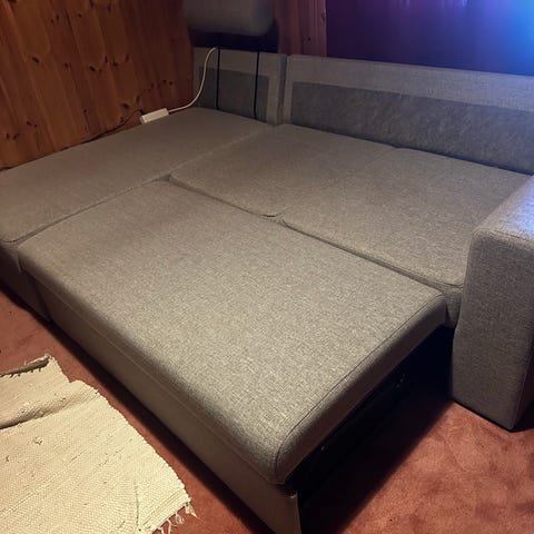 Sofaen er egentlig en uttrekkbar sovesofa, men utrekkdelen er skadet. Kan fint sette utrekksdelen inn og benytte den som vanlig sofa. Passer på hybel eller liten stue. Noen flekker som sikkert kan renses bort, ellers hel. Lagrings rom under ene del. Lite lett bord og liten tv kan følge med. Førstemann til mølla. Står i kjellerleilighet på Jessheim, må bæres ut av henter
