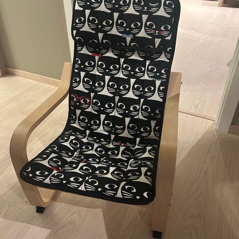 IKEA lenestol til barn med rødt trekk. Stolen har buede armlener og ben i lyst treverk. Passer til barn og kan brukes på barnerom, lekerom eller i stue som egen sitteplass for barn. Stabil konstruksjon tilpasset barnas størrelse.