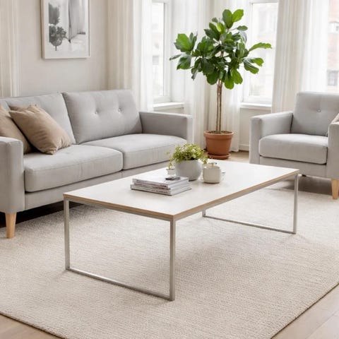 Pent salongbord fra Bolia, en klassiker. Lakkert stål understell og massiv eik bordplate. Denne kan lett slipes og oljes. Nytt identisk bord koster over 13.000 kr.