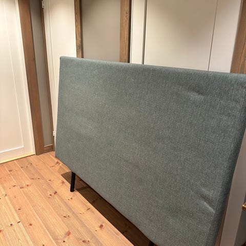 Sengegavl i brun fløyel med nagler. 160 cm bred. Hentes på Brandbu.