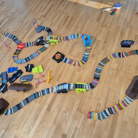 Flexi Track Ninja Turtles bilbane med fleksible skinneelementer i grønn-, lilla- og hvitfarger. Banen består av flere deler som kan settes sammen på ulike måter, blant annet broer, ramper og tematiske elementer inspirert av Ninja Turtles-universet. Det følger med tre batteridrevne biler som kjører rundt banen av seg selv. Plastmateriale. Den var brukt da vi fikk den, og den bærer litt preg av normal slitasje, men her har den vært behandlet pent og det er mye brukt igjen. Vi har hatt mye glede av banen, men guttungen har nå mye annet å leke med og ønsker derfor å selge flexi Track banen sin.