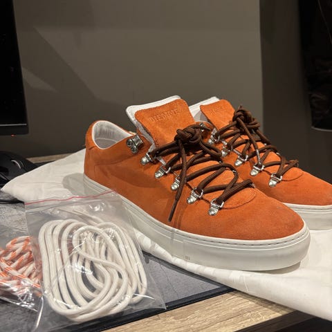 Diemme sneakers joggesko i størrelse 42. Modellen er i blå semsket skinn med hvit gummisåle. Skoene har snøring med metallhemper og polstret pløse for bedre komfort. Passer som hverdagssko og fritidssko i sesonger med tørt vær. Innvendig såle og fôr er laget for vanlig bruk i urbane omgivelser.