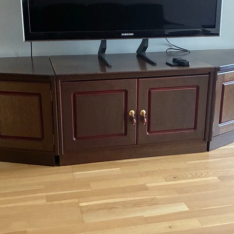 Kjempe solid, men godt brukt TV-benk. Hull på toppen etter barnesikring. Praktisk plass til oppbevaring av ledninger. Misfarget på kantene (soleksponert). Benken er demontert for transport. Må hentes på Finstadbru.