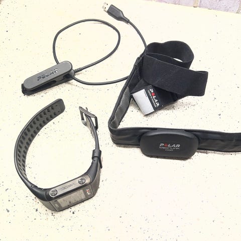 Polar FT60 pulsklokke i svart med tilhørende Polar brystbelte og Polar G1 GPS-modul.
