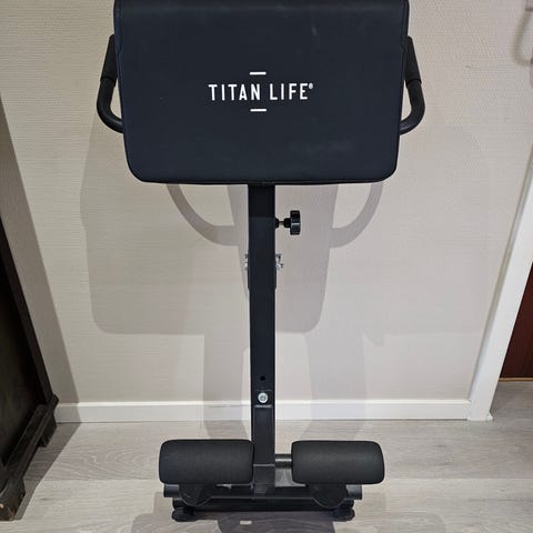 Titan ryggtrener treningsbenk i grått stål med røde detaljer og svart polstret pute. Benken er justerbar i høyden via hull og låseskrue på rammen, slik at vinkelen kan tilpasses brukerens lengde og ønsket øvelsesnivå. Utstyrt med skumruller for støtte til ben og håndtak på siden av puten for ekstra stabilitet under øvelser. Egnet for rygg- og kjernestyrkeøvelser hjemme eller i mindre treningsrom.