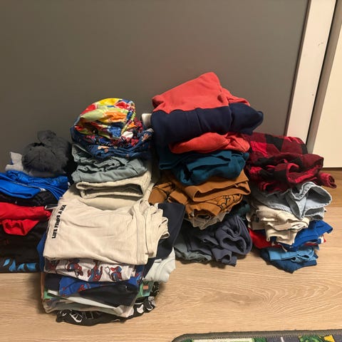 Klespakke til gutt selges. Noen av klærne er hele og fine, mens andre har en flekk her og der. Alt fra hettegensere til ullundertøy. Første bilde illustrerer innholdet. Vil helst bli kvitt klærne, så kom gjerne med bud. Har også en grønn regnjakke/kåpe 116 om det trengs. Kan også slenge ved noen boxere om det skulle være av interesse.