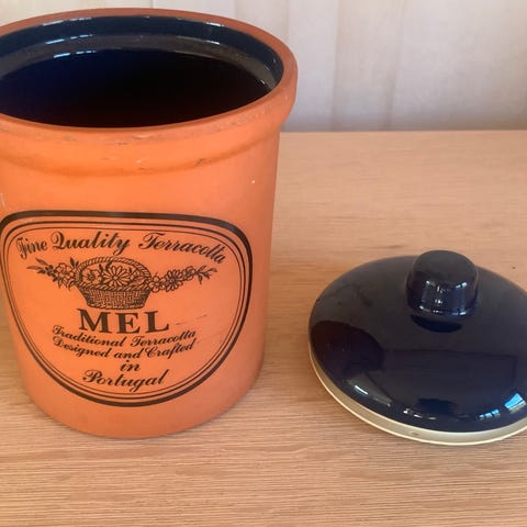 Gul krukke- glasert keramikk med lokk. Turcany Terracotta.