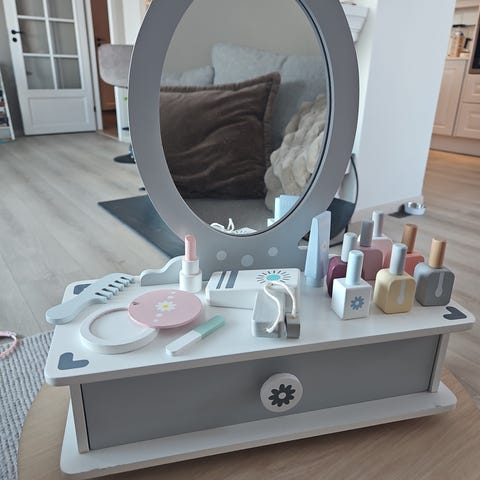 sminkebord for barn med ovalt speil og matchende krakk. Bordet har dekor med motiv fra en frost. Mye bruk igjen.