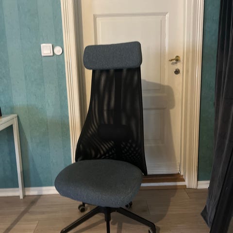 IKEA kontorstol i svart stoff. Stolen har polstret sete og rygg, samt enkel ryggstøtte som kan justeres noe i vinkel. Understell med hjul gjør den lett å flytte rundt. Egnet som enkel skrivebords- eller kontorstol til hjemmekontor, barnerom eller arbeidsplass. Materiale er tekstil med plast- og metallunderstell.