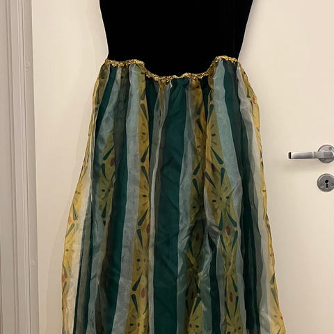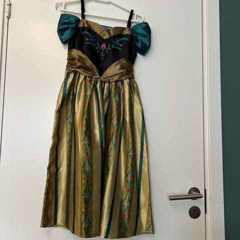 Anna Kostyme kjole for dame med tilhørende kappe. Kjolen har blå skjørtedel med blomsterdetaljer nederst, svart overdel med brokadeinspirert grønt og rødt mønster, samt lange ermer i lys blå. I midjen er det en gullfarget kant. Kappen er rosa med mørke dekorbånd langs kanten. Passer til utkledning, karneval eller temafester. Str. S / M