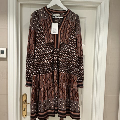 Kjolen har flatterende V-hals, markert liv og lett utsvinget skjørt. Perfekt til både fest, selskap og pent hverdagsbruk.