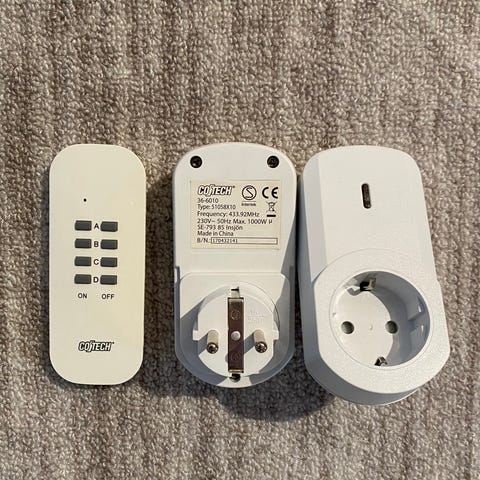 Et sett består av 3 stk. fjernstrømbrytere og 1 stk. fjernkontroll.