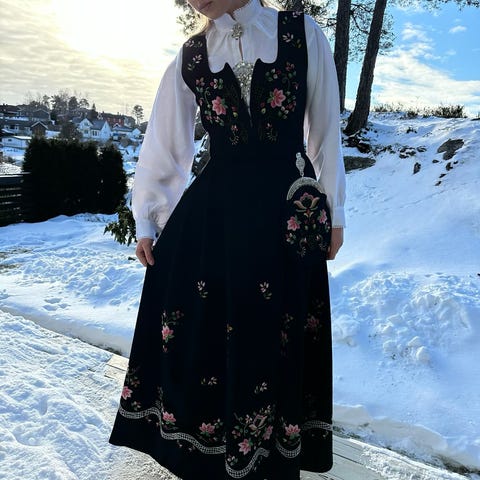 God vedlikehold eldre kvalitets håndbrodert Lundeby bunad. Passer nok i høyden 155-165 se bilder for mål. Bør prøves.