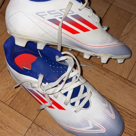 Sett med meget pent brukte fotballsko og leggskinn. Én fotballsko i oransje farge med snøring og middels høy ankelsokksilhuett, samt én fotballsko i hvit/grå farge med røde og blå detaljer og tradisjonell snøring. Begge er størrelse 34. I tillegg følger et par svarte leggskinn med lyse striper. Utstyr egnet for fotballspill på gressbane, for spiller som trenger både sko og leggskinn i samme pakke. Selges samlet for Kr. 300,-