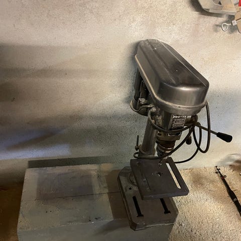 Selger et borestativ med en eldre drill til.