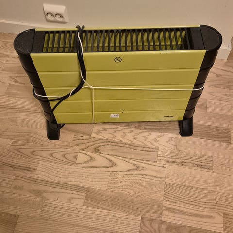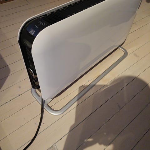 Frittstående elektrisk panelovn med stålfront og integrert gulvstativ. Ovnen har digitalt display i front med temperaturvisning og betjeningsknapper. Mulig å styre via Wi-Fi og app på telefon