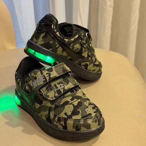 Nike joggesko for barn i størrelse 25. Skoene er unisex og har blå overdel med røde detaljer og hvit såle. Modellen har to borrelåsstropper som gjør det enkelt å ta skoene av og på.
