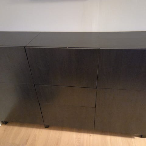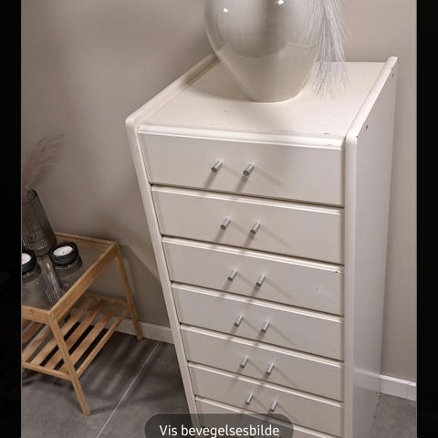 Nymalt svart kommode med 3 store skuffer, gull håndtak og spiler. Stått både på soverom, stue og bad. I god stand, men nederste skuff har noen bruksmerker innvendig.
