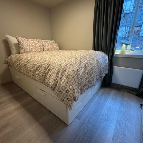 Sengen har integrert oppbevaring med fire skuffer under liggeflaten, som gir ekstra plass til sengetøy, klær eller annet utstyr. Passer godt i soverom med behov for kombinert sove- og oppbevaringsløsning. Overmadrass, dyne og puter er ikke inkludert.