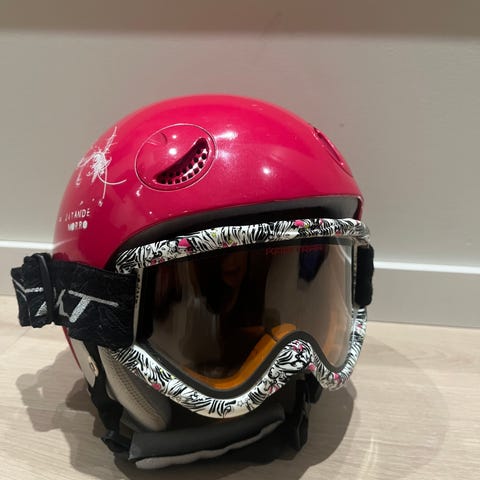 Frost skihjelm med tilhørende skibriller i rosa farge. Hjelmen har justerbar hakereim og feste bak for skibriller. Innsiden har polstret innredning for bedre komfort. Passer til bruk i alpinbakke og annen vintersport der hodebeskyttelse er nødvendig.