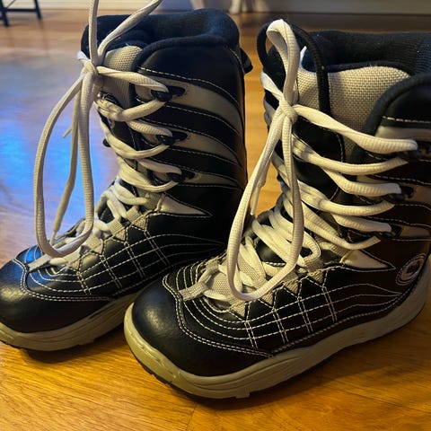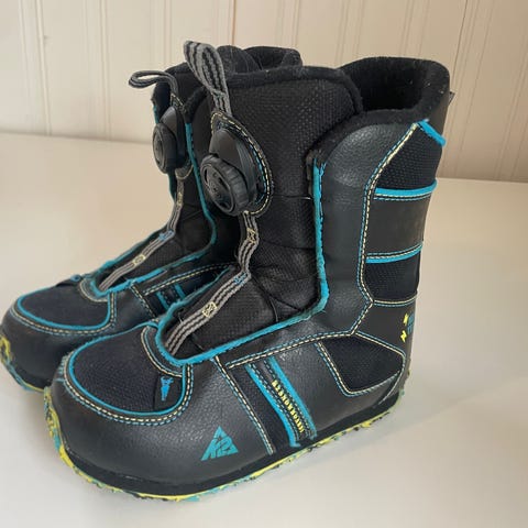 Snowboardstøvler for barn i størrelse EU 33 (US 2, UK 1, 21,0 cm). Støvlene har snøring foran og høyt skaft for støtte rundt ankel. Fargekombinasjon blå og grå med hvit såle og brun yttersåle. Polstret innside for komfort og hempe bak for enklere av- og påtaking.