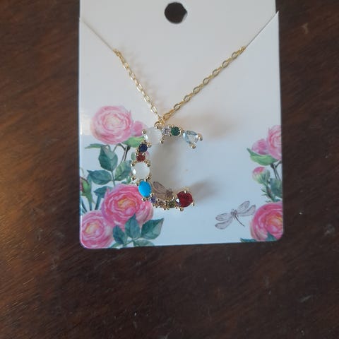 Nydelig og elegant halskjede med bokstaven F, dekorert med vakre fargerike stener. Perfekt som personlig smykke eller gave til noen du er glad i.