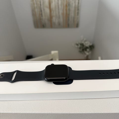 Apple Watch smartklokke med rektangulær skjerm og digital krone på siden. Klokken leveres med to ulike armbånd, ett svart og ett brunt, begge med hulljustering og klassisk spenne. I tillegg følger det med magnetisk ladekabel og original eske. Egnet for daglig bruk, trening og varslinger når den er paret med kompatibel iPhone.