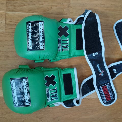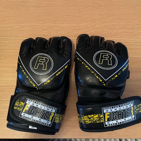 Fighter MMA hansker i størrelse L i svart farge. Åpne fingre og polstret overdel gir bevegelsesfrihet samtidig som knokene er beskyttet. Hanskene har justerbar borrelåslukking rundt håndleddet for bedre passform og støtte. Egnet til MMA, kampsporttrening og sparring der det kreves gripeevne og slagbeskyttelse.