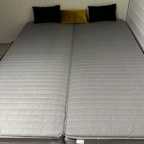 IKEA dagseng. Sengen har høye side- og bakplater og innebygde skuffer under liggeflaten for oppbevaring. Passer som enkeltseng eller dobbeltseng. To pocketfjærmadrasser følger med. Disse er lite brukt.