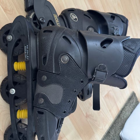 Rulleskøyter i størrelse 38. Modellen har hard ytre skall i svart med gule detaljer og polstret, gul innersko for bedre komfort. Skøytene har spennelukking og rem over vristen for å gi bedre støtte rundt ankel og fot. Understellet har fire hjul på rekke (inlines). Egner seg til bruk på asfalt og andre jevne underlag.