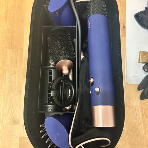 Dyson Airwrap hair styler with multiple accessories. Comes in a case with main unit and various styling heads, including brushes and cylindrical curling nozzles. Suitable for styling and drying hair with different hairstyles and textures. Colour combination with metallic grey and pink details. Comes in a storage case that protects the unit and keeps the accessories together.
