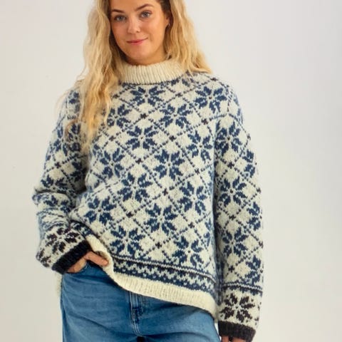 Ny Skappel Dugg ullgenser akkurat tatt av pinnene 💜 generen er strikket i orginalgarnet garnet myk fra Skappel i fargen lilla orkidé, pastellgrønn og naturhvit. Gensern er strikket L i bredden, men M i høyden. Altså er den ganske oversized, men ikke for lang i armene.