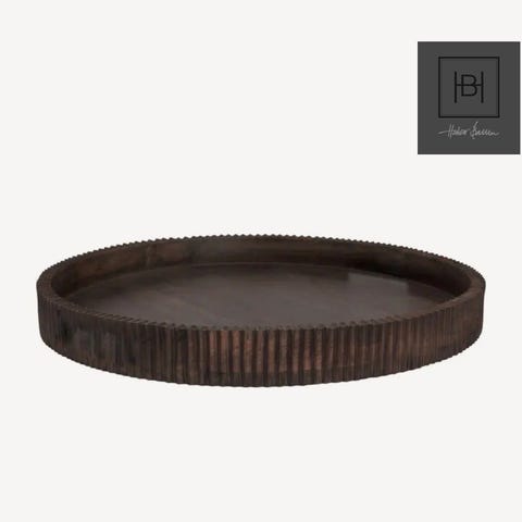 Rundt brett laget av mørkbeiset mangotre med en litt hevet kant. Brettet har et dekorativt, stråleinspirert mønster som strekker seg fra midten.