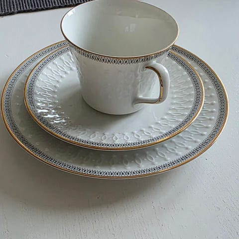 Kaffe service litt ujevnt med gull dekoren ellers hel og pen.