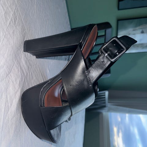 Ecco hæler i størrelse 39. Skoene er svarte med høy, kraftig hæl og platå foran. Modellen har lukket tå og hælkappe med rem og spenne rundt ankelen.