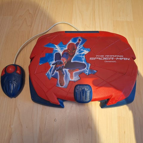 Spiderman elektronisk leke‑laptop med tilhørende walkie talkies. Leke‑laptopen har Spiderman‑motiv, tastatur og tilkoblet mus. Walkie talkiene har samme tema og er utformet for barn. Egnet som elektronisk lærings- og rollelekleke for barn som liker superheltuniverset til Spiderman.